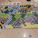 Gestern beim Spieletreffen in Neuss waren wir zunächst zu Dritt und versuchten uns an Stefans Neuerwerb – er hatte ein Kingdom Builder für sechs Euro bekommen und es noch nie gespielt. Wir konnten die Partie beenden, als Thorsten dazu stiess und mit einem knappen 34/30/24 Ergebnis ein Resumee ziehen. Mein Spiel ist es wirklich nicht, eine Karte ziehen und dann darauf Häuser platzieren ist mir zu mager. Die Erweiterungen sollen ja noch was retten, aber ich bin froh, damit den „pile of shame“ verringert zu haben. Gebe dem Spiel eine 3/10.